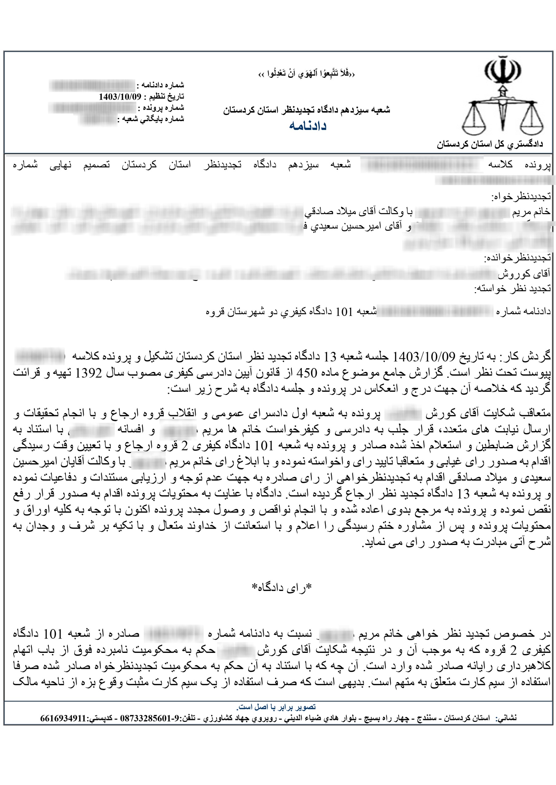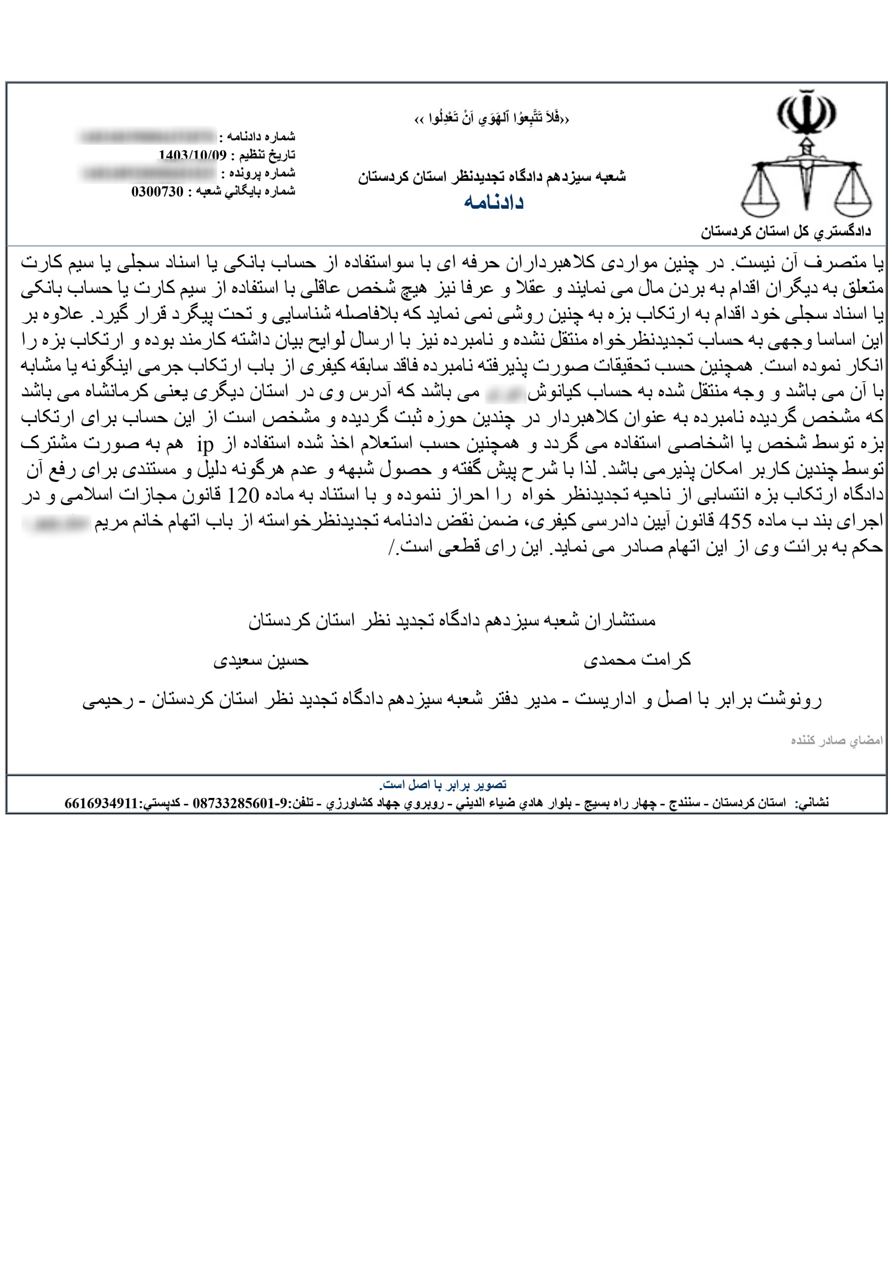 در خصوص تجدید نظر خواهی خانم مریم صادره از شعبه ۱۰۱ دادگاه کیفری ۲ قروه که به موجب آن و در نتیجه شکایت آقای کورش حکم به محکومیت نامبرده فوق از باب اتهام کلاهبرداری رایانه صادر شده وارد است. آن چه که با استناد به آن حکم به محکومیت تجدید نظر خواه صادر شده صرفا استفاده از سیم کارت متعلق به متهم است. بدیهی است که صرف استفاده از یک سیم کارت مثبت وقوع بزه از ناحیه مالک یا متصرف آن نیست.