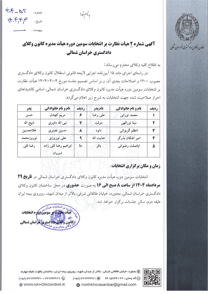 در راستای اجرای ماده ۱۵ آییننامه اجرایی لایحه قانونی استقلال کانون وکلای دادگستری مصوب ۱۴۰۰ و اصلاحات بعدی آن، و بر اساس تصمیم جلسه مورخ ۱۴۰۴/۰۴/۰۴ هیأت نظارت بر انتخابات سومین دوره هیأت مدیره کانون وکلای دادگستری خراسان شمالی، اسامی کاندیداهای احراز صلاحیت شده جهت انتخابات به شرح زیر اعلام میگردد: