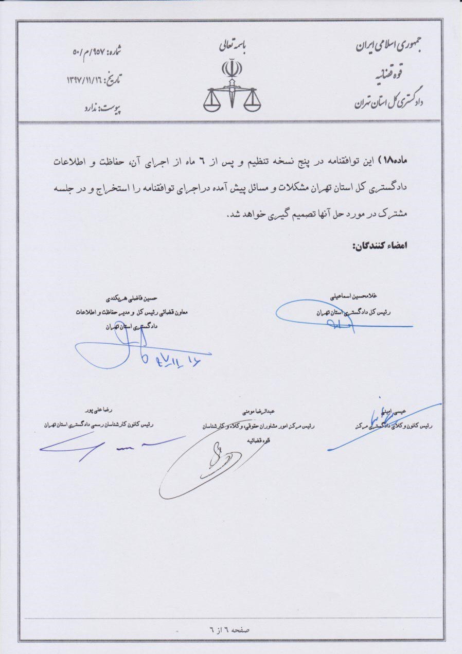 ماده ۱۸) این توافقنامه در پنج نسخه تنظیم و پس از ۶ ماه از اجرای آن، حفاظت و اطلاعات دادگستری کل استان تهران مشکلات و مسائل پیش آمده در اجرای توافقنامه را استخراج و در جلسه مشترک در مورد حل آنها تصمیمگیری خواهد شد.