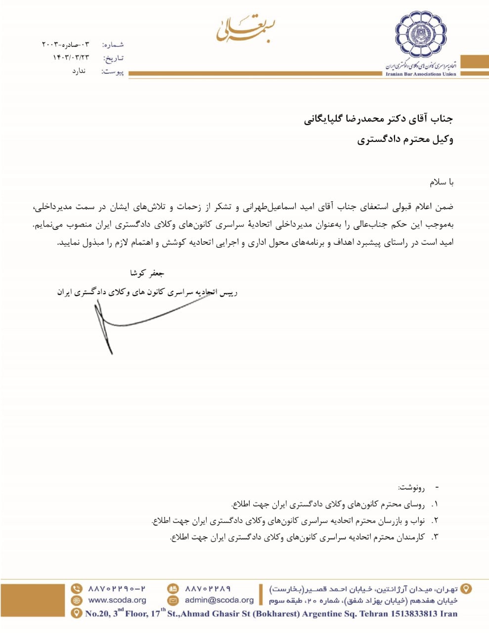 ضمن اعلام قبولی استعفای جناب آقای امید اسماعیلطهرانی و تشکر از زحمات و تلاشهای ایشان در سمت مدیر داخلی، بهموجب این حکم جنابعالی را بهعنوان مدیر داخلی اتحادیۀ سراسری کانونهای وکلای دادگستری ایران منصوب مینمایم. امید است در راستای پیشبرد اهداف و برنامههای محول اداری و اجرایی اتحادیه کوشش و اهتمام لازم را مبذول نمایید.
