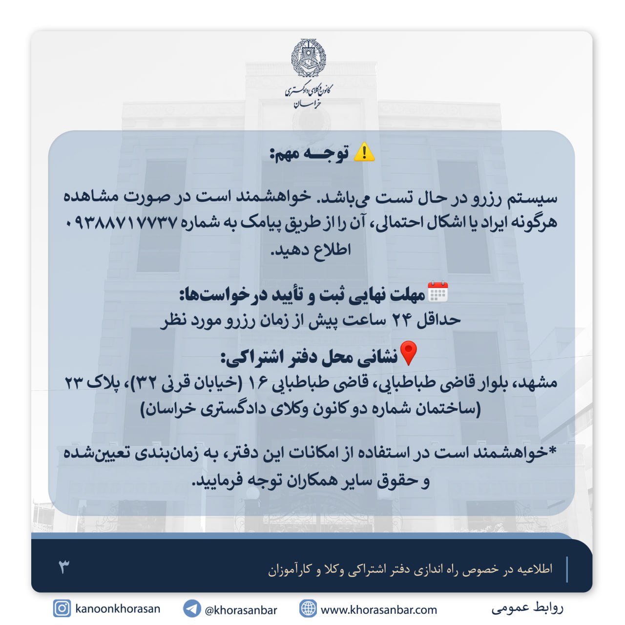 به اطلاع همکاران گرامی و کارآموزان محترم عضو کانون وکلای دادگستری خراسان میرساند: