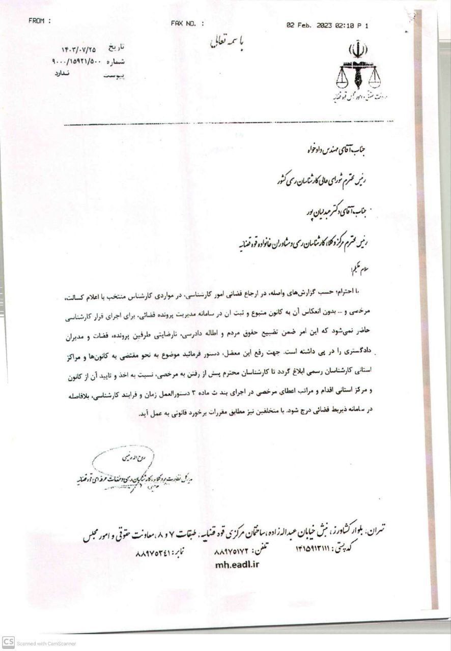 نامه مدیر کل نظارت بر وکلا و کارشناسان رسمی قوه قضائیه در خصوص ضرورت ثبت مرخصی کارشناسان