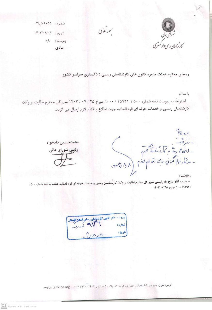 احتراما، به پیوست نامه شماره ۵۰۰ / ۱۵۹۲۱ / ۹۰۰۰ مورخ ۲۵/ ۱۴۰۳/۰۷ مدیرکل محترم نظارت بر وکلا، کارشناسان رسمی و خدمات حرفهای قوه قضائیه جهت اطلاع و اقدام لازم ارسال میگردد.