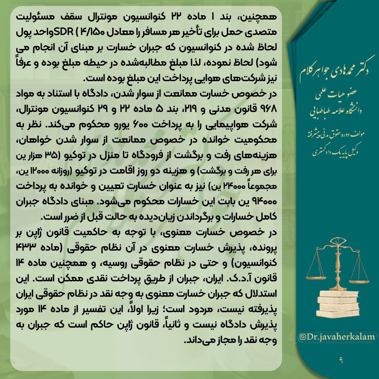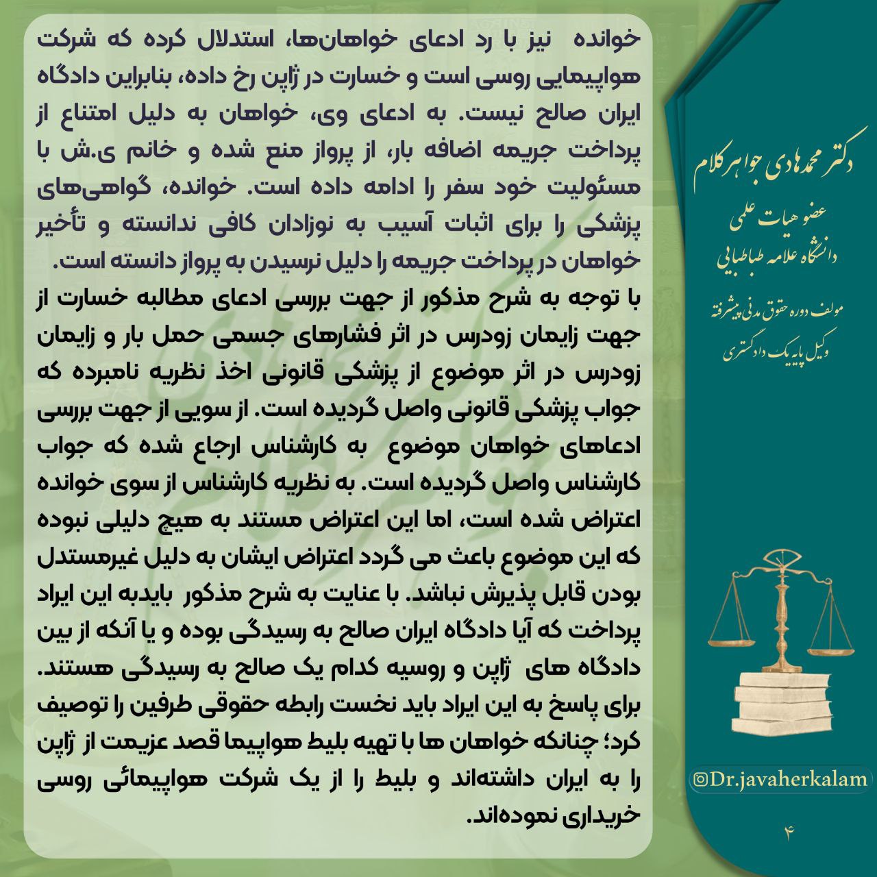 ثالثاً اگر هم قانون این کشور حاکم نمیگردید و قانون ایران حاکم بود و به لحاظ اینکه خوانده روسی بوده و در نظام حقوقی روسیه این نحوه جبران خسارت مورد پذیرش قرار دارد به حکم قاعده فقهی الزام (الزموهم بما ألزموا أنفسهم) امکان جبران خسارت به این طریق قابل پذیرش میگردند. نظر به مبانی مذکور مستنداً به مواد ۹۸۶ قانون مدنی مواد ۲۹ و (۴) ۳۳ کنوانسیون مونترال حکم بر محکومیت خوانده به ۱۰۰/۰۰۰/۰۰۰ ریال به هر یک از خواهانها جمعاً ۲۰۰/۰۰۰/۰۰۰ ریال محکوم مینماید. در خصوص مطالبه خسارت تأخیر تأدیه مطالبه شده با توجه به اینکه قانون در این پرونده به لحاظ حکومت قانون ژاپن، امری موضوعی بوده که باید از سوی خواهان ارائه میگردید و خواهان اقدامی در ارائه قانون در این خصوص از نظام حقوقی ژاپن ننموده است، و بدون ارائه قانون امکان ارزیابی آن برای دادگاه نبوده مستنداً به ماده ۲ قانون آ.د.م قرار عدم استماع دعوی در این خصوص صادر میشود. در خصوص مطالبه خسارات دادرسی پرونده کلاسه ۰۱۰۰۱۳۸ این دادگاه مستنداً به مواد ۵۱۵ و ۵۱۵ قانون آ.د.م حکم بر محکومیت خوانده به پرداخت ۹۶۸/۹۱۴/۴۶۱ ریال صادر مینماید که چون خواهان اعسار از پرداخت هزینه دادرسی داده و پذیرفته است مستندا به ماده ۵۱۱ قانون آ.د.م در زمان اجرای حکم از کل محکوم به کسر و به حساب دادگستری واریز میگردد. همچنین دادگاه خوانده را محکوم به پرداخت مبلغ ۱۰۰ میلیون ریال بابت هزینه کارشناسی مینماید. رای صادره حضوری و ظرف ۲۰ روز پس از ابلاغ قابل تجدیدنظرخواهی در محاکم تجدیدنظر استان تهران است.