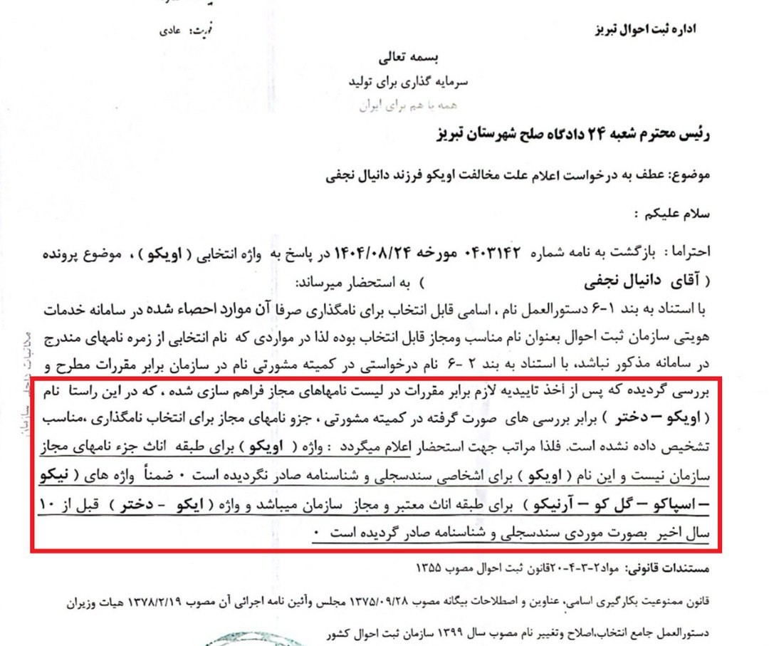 لایحه اداره ثبت احوال تبریز در مخالفت با ثبتنام اویکو