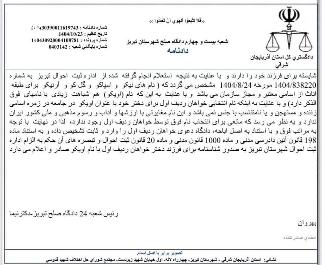 در خصوص دادخواست خواهانها ۱- آقای دانیال … به طرفیت اداره ثبت احوال شهرستان تبریز به خواسته الزام خوانده به تایید نام اویکو و صدور شناسنامه با نام اویکو برای فرزند خواهان ردیف اول متولد ۱۴۰۴/۵/۱۵، مشروحا بدین شرح که اینجانب به عنوان پدر نوزاد دختر که در تاریخ ۱۴۰۴/۵/۱۵ متولد شده است، قصد داشت اسم فرزندش را اویکو بگذارد ولی اداره ثبت احوال شهرستان تبریز به دلایل غیر موجه از ثبت این نام خودداری نمود و با توجه به اینکه این نام از نامهای ممنوعه نبوده و مغایر با موازین شرعی و یا هنجارهای اجتماعی نمیباشد و در فرهنگ عمومی و عرف جامعه ایرانی رایج میباشد و اداره ثبت احوال هم دلایل قانونی و موجهی برای رد نمودن این نام ارائه نکرده است و حق والدین تعیین نام نیکو برای فرزندان خود میباشد لذا تقاضای محکومیت و الزام خوانده به صدور شناسنامه برای دختر اینجانب با نام اویکو مورد استدعاست.