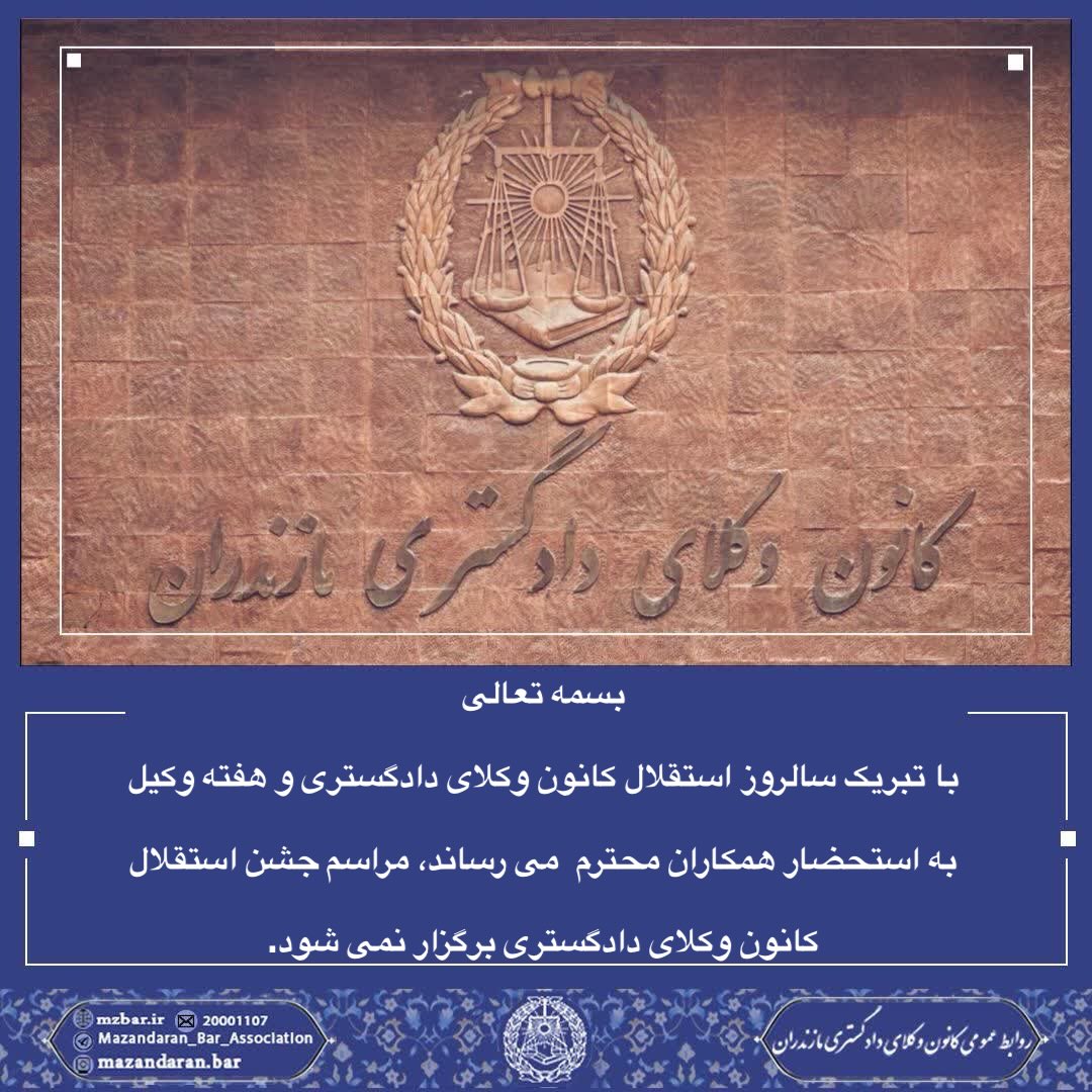 با تبریک سالروز استقلال کانون وکلای دادگستری و هفته وکیل به استحضار همکاران محترم می رساند، مراسم استقلال کانون وکلای دادگستری برگزار نمی شود.
