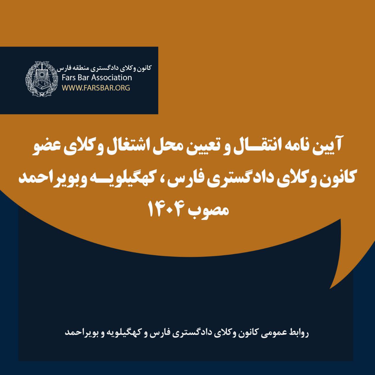 آیین نامه انتقال و تعیین محل اشتغال و کلای عضو کانون وکلای دادگستری فارس، کهگیلویه و بویر احمد مصوب ۱۴۰۴