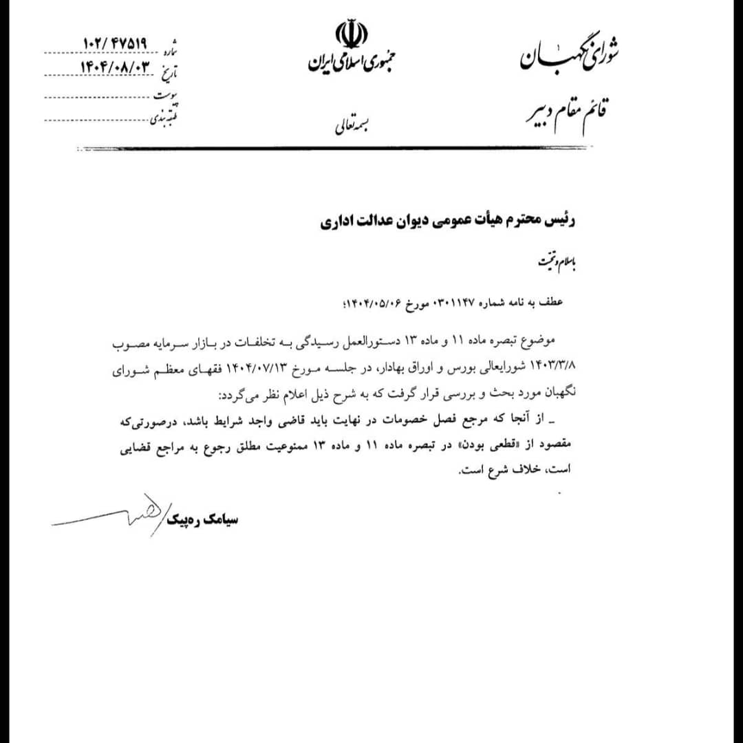 بنابراین در اجرای حکم مقرر در ماده ۸۷ قانون دیوان عدالت اداری مصوب سال ۱۳۹۲ مبنی بر لزوم تبعیت هیأت عمومی دیوان عدالت اداری از نظر فقهای شورای نگهبان در خصوص جنبه شرعی مقررات اجرایی تبصره ماده ۱۱ و ماده ۱۳ دستور العمل رسیدگی به تخلفات در بازار سرمایه مصوب ۱۴۰۳/۳/۸ شورای عالی بورس و اوراق بهادار با توجه به رأی جلسه مورخ ۱۴۰۴/۱/۲۵ هیات تخصصی اداری و امور عمومی دیوان عدالت اداری که بر اساس آن قطعی بودن آراء هیاتهای رسیدگی به معنای عدم امکان رجوع به مراجع قضایی نیست مغایرتی با موازین شرعی ندارد. این رأی براساس ماده ۹۳ قانون دیوان عدالت اداری (اصلاحی مصوب ۱۴۰۲/۲/۱۰) در رسیدگی و تصمیم گیری مراجع قضایی و اداری معتبر و ملاک عمل است.