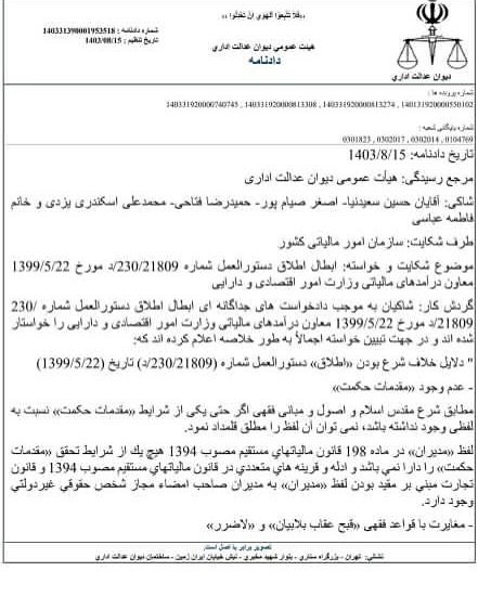 شاکی: آقایان حسین سعیدنیا- اصغر صیام پور – حمیدرضا فتاحی- محمد علی اسکندری یزدی و خانم فاطمه عباسی طرف شکایت: سازمان امور مالیاتی کشور