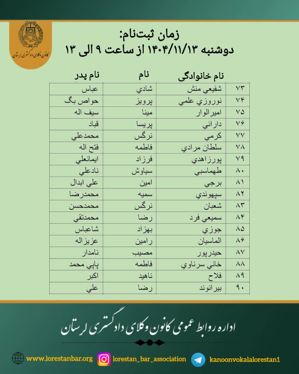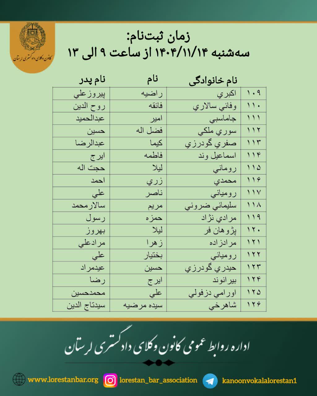 بدینوسیله به اطلاع کلیه پذیرفته‌شدگان آزمون کار‌آموزی وکالت سال ۱۴۰۴ کانون وکلای دادگستری لرستان می‌رساند: ️ ️فرآیند ثبت نام بصورت حضوری در محل کانون وکلای دادگستری لرستان انجام می‌شود. پذیرفته‌شدگان می‌بایست مطابق جداول و زمانبندی معینه، در ایام اعلامی و رأس ساعت مقرر برای ثبت‌نام و تشکیل پرونده با همراه داشتن مدارک در محل کانون وکلای دادگستری لرستان واقع در شهرستان خرم‌آباد، میدان کیو، انتهای بلوار ولیعصر، حاضر شوند. ️️