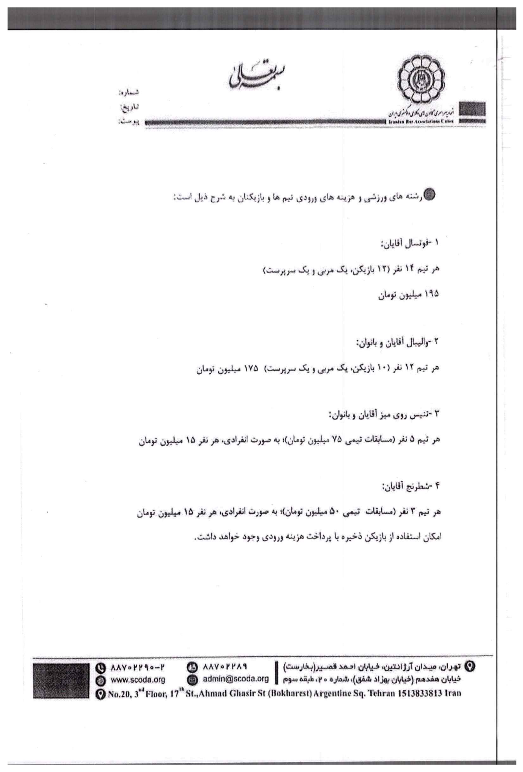 همچنین هزینه ثبت نام برای هر تیم در رشته فوتسال ۱۹۵ میلیون تومان، هر تیم در رشته والیبال ۱۷۵ میلیون تومان، هر تیم در رشته تنیس ۷۵ میلیون تومان و هر تیم در شطرنج ۵۰ میلیون تومان اعلام شده است.