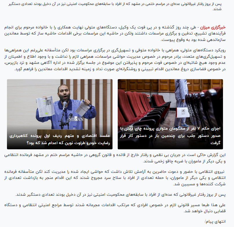 ین گزارش حاکی است در جریان بی نظمی و رفتار خارج از قائده و قانون گروهی در حاشیه مراسم ختم در مشهد فرمانده انتظامی و یکی دیگر از ماموران با ضربه چاقو زخمی شدند.