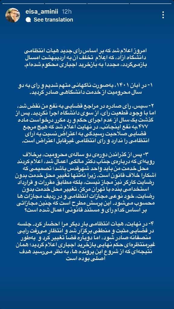 امروز اعلام شد که بر اساس رأی جدید هیئت انتظامی #دانشگاه_آزاد، که اعلام تخلف آن به اردیبهشت امسال بازمیگردد، مجدداً به بازخرید اجباری محکوم شدم.