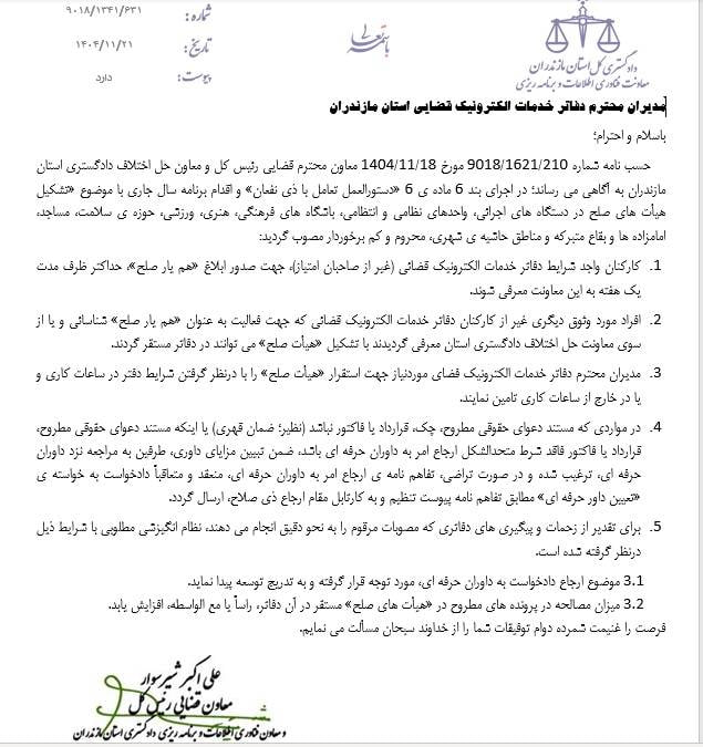 بخشنامه دادگستری مازندران مبنی بر تشکیل و استقرار «هیئت صلح» در دفاتر خدمات الکترونیک قضائی به منظور ترغیب مراجعان به تغییر عنوان خواسته دعوا به «تعیین داور حرفه‌ای»