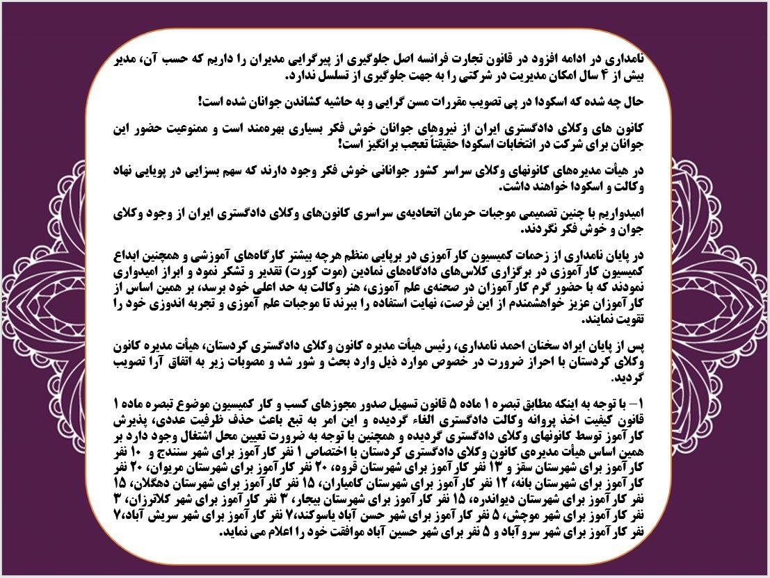 در هیأت مدیره های کانونهای وکلای سراسر کشور جوانانی خوش فکر وجود دارند که سهم بسزایی در پویایی نهاد وکالت و اسکودا خواهند داشت. امیدواریم با چنین تصمیمی موجبات حرمان اتحادیه ی سراسری کانونهای وکلای دادگستری ایران از وجود وکلای جوان و خوش فکر نکردند.