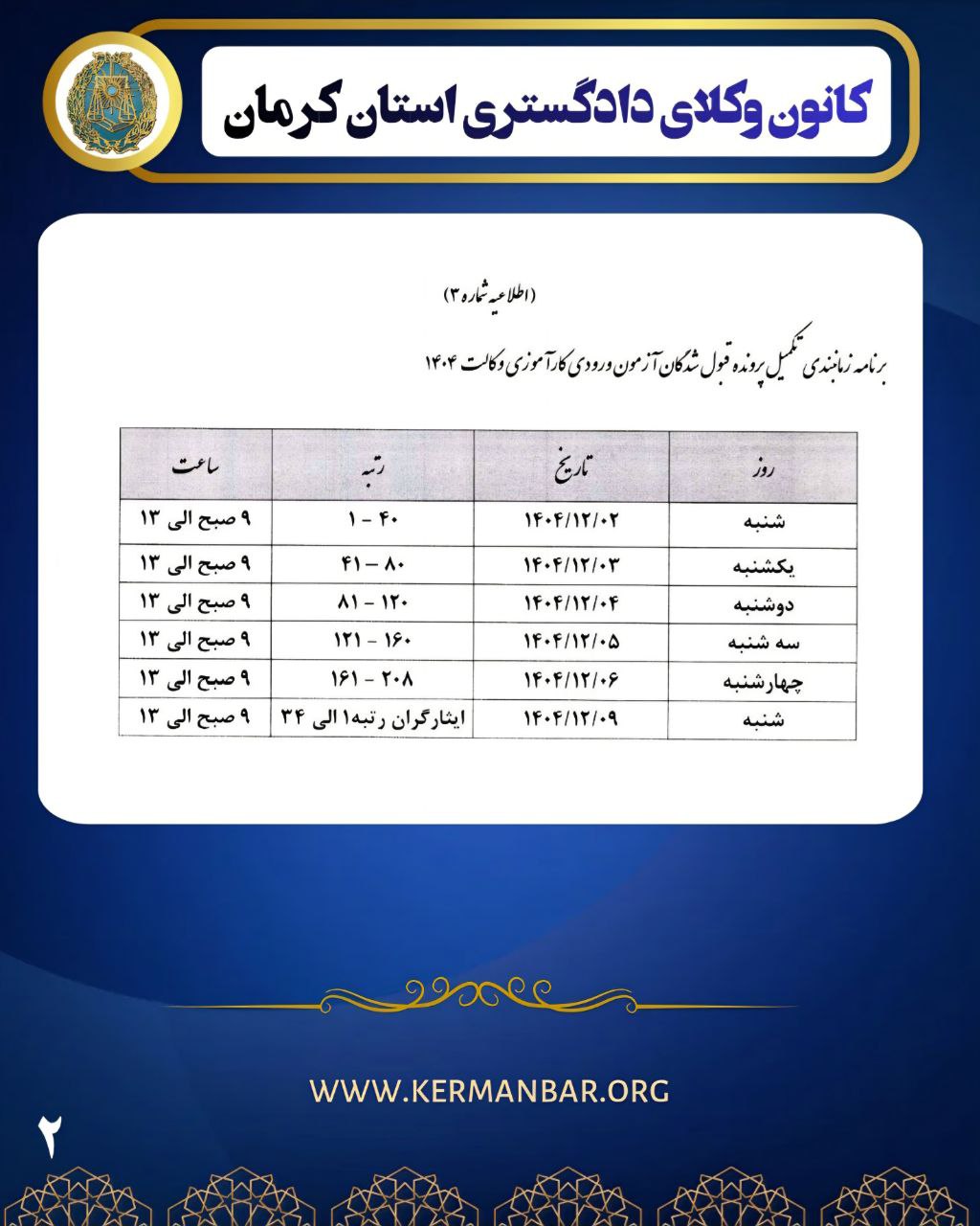 برنامه زمانبندی مراجعه حضوری پذیرفته شدگان کانون وکلای دادگستری کرمان در آزمون وکالت ۱۴۰۴