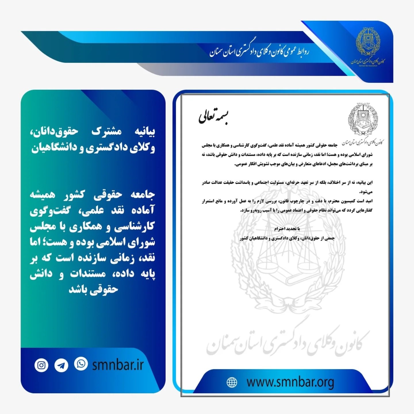 جامعه حقوقی کشور همیشه آماده نقد علمی، گفت و گوی کارشناسی و همکاری با مجلس شورای اسلامی بوده و هست؛ اما نقد زمانی سازنده است که بر پایه داده، مستندات و دانش حقوقی باشد نه بر مبنای برداشت های مجمل ادعاهای متعارض و بیان های موجب تشویش افکار عمومی.