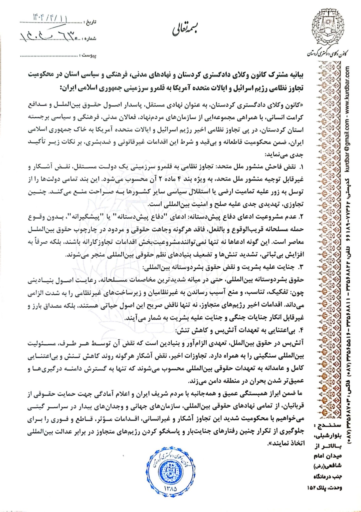 «کانون وکلای دادگستری کردستان به عنوان نهادی مستقل پاسدار اصول حقوق بین الملل و مدافع کرامت انسانی با همراهی مجموعه ایی از سازمانهای مردم نهاد فعالان مدنی فرهنگی و سیاسی برجسته استان کردستان در پی تجاوز نظامی اخیر رژیم اسرائیل و ایالات متحده آمریکا به خاک جمهوری اسلامی ایران ضمن محکومیت قاطعانه و بی قید و شرط این اقدامات غیر قانونی و ضدبشری بر نکات زیر تأکید جدی می نماید: