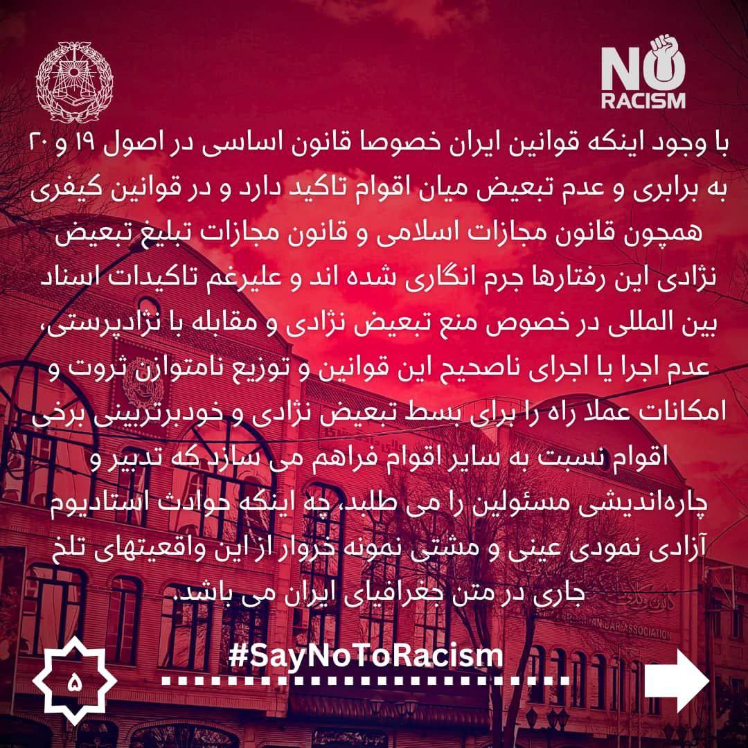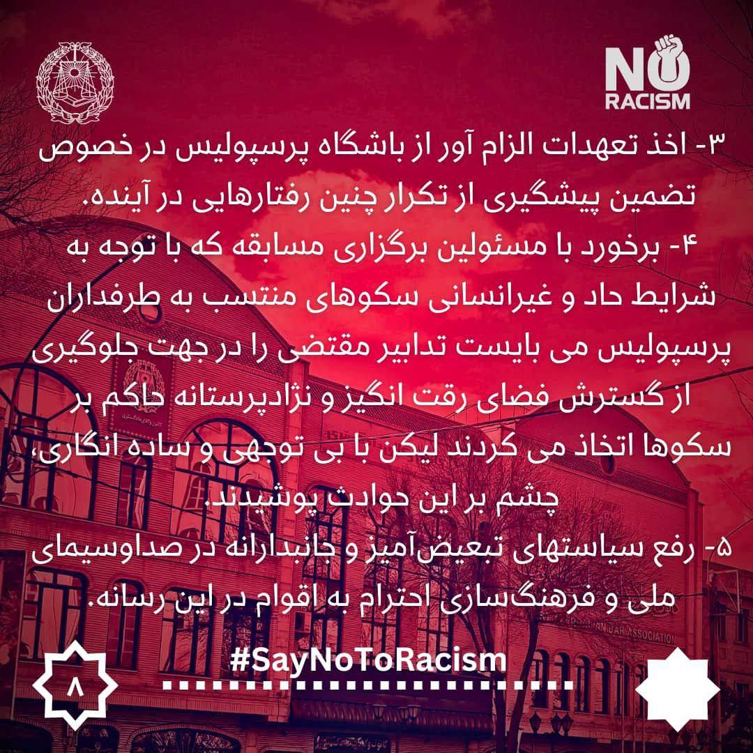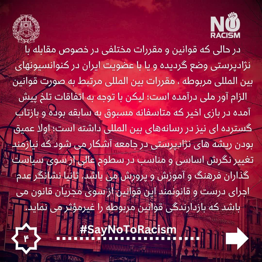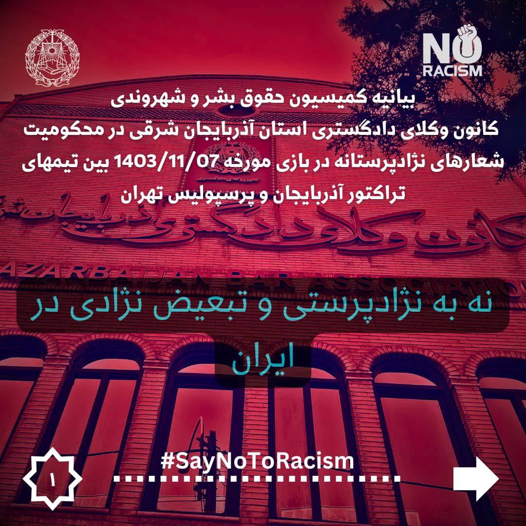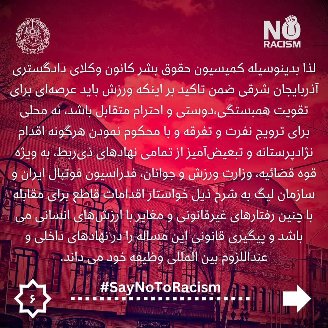 لذا بدین وسیله کمیسیون حقوق بشر کانون وکلای دادگستری آذربایجان شرقی ضمن تاکید بر اینکه ورزش باید عرصه‌ای برای تقویت همبستگی، دوستی و احترام متقابل باشد، نه محلی برای ترویج نفرت و تفرقه و با محکوم نمودن هرگونه اقدام نژاد پرستانه و تبعیض آمیز از تمامی نهادهای ذی‌ربط، به ویژه قوه قضائیه، وزارت ورزش و جوانان، فدراسیون فوتبال ایران و سازمان لیگ به شرح ذیل خواستار اقدامات قاطع برای مقابله با چنین رفتارهای غیرقانونی و مغایر با ارزش‌های انسانی می‌باشد و پیگیری قانونی این مساله را در نهادهای داخلی و عنداللزوم بین‌المللى وظیفه خود می‌داند.