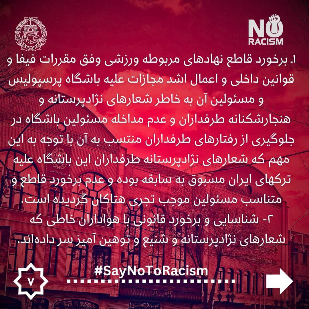 ۱- برخورد قاطع نهادهای مربوطه ورزشی وفق مقررات فیفا و قوانین داخلی و اعمال اشد مجازات علیه باشگاه پرسپولیس و مسئولین آن به خاطر شعارهای نژادپرستانه و هنجارشکنانه طرفداران و عدم مداخله مسئولین باشگاه در جلوگیری از رفتارهای طرفداران منتسب به آن با توجه به این مهم که شعارهای نژادپرستانه طرفداران این باشگاه علیه ترک‌های ایران مسبوق به سابقه بوده و عدم برخورد قاطع و متناسب مسئولین موجب تجرى هتاکان گردیده است.