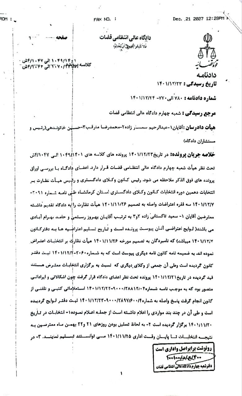 در خصوص اعتراض معترضین به تصمیم هیات نظارت مورخ ۱۴۰۱/۱۱/۲۶ دهمین دوره ی انتخابات هیات مدیره کانون وکلای دادگستری کرمانشاه به اسامی اعلامی آقایان بهروز رستمی، سعید تاکستانی زاده ،وحید باتمانی، بهراد میرزایی، سید مهدی موسوی، سید محمد اکبری، علی عباس حیاتی و بیژن قنبزی و خانمها سهیلا دوریشی و فوزیه کاووسی که دادگاه با امعان نظر در محتویات پرونده و توجهاً به تحقیقات به عمل آمده در پرونده ها و صورتجلسه مشاهده تصاویر و مکالمات مشاهده لوح های فشرده توسط اعضای دادگاه و مدارک و اوراق ابرازی از ناحیه معترضین صحت ادعا به کیفیتی که اعلام گردیده تشخیص داده نمی شود. بنابراین دادگاه به استناد ماده ۲۵ آئین نامه اجرایی لایحه ی استقلال کانون وکلای دادگستری مصوب ۱۴۰۰ ضمن رد اعتراضات واصله تصمیم هیات مدیره فوق الذکر تأیید می نماید رأی صادره قطعی است.