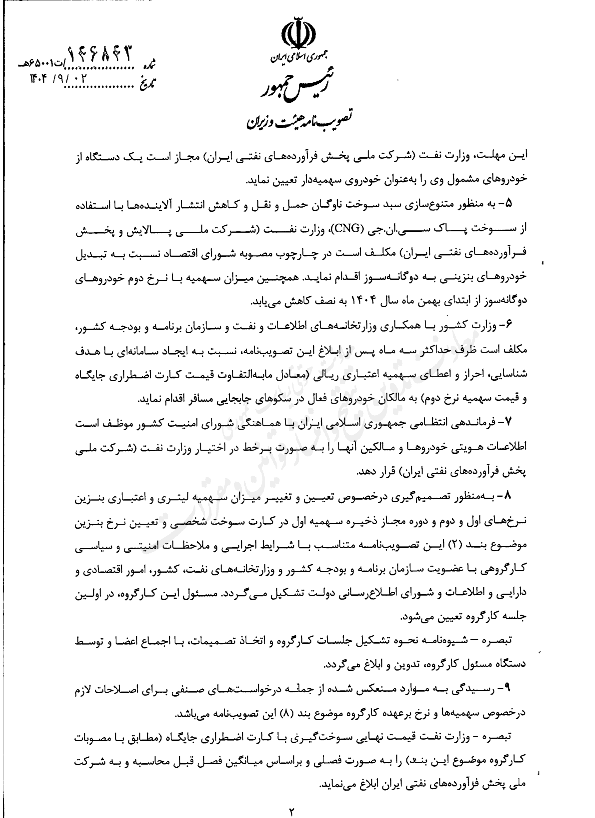 ۲- از نیمه دوم آذرماه ۱۴۰۴ نرخ سوخت گیری بنزین خودروها با استفاده از کارت اضطراری جایگاه معادل حداقل ده درصد (۱۰) قیمت خرید بنزین از پالایشگاه ها ۵۰,۰۰۰) ریال در زمان ابلاغ این تصویب نامه تعیین میشود.