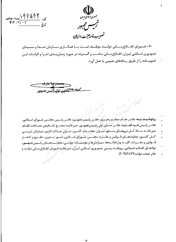 ۱۰- شورای اطلاع رسانی دولت موظف است با همکاری سازمان صدا و سیمای جمهوری اسلامی ایران اطلاع رسانی مناسب و گسترده در مورد زمان بندی اجرا و الزامات این تصویب نامه را از طریق رسانه های عمومی به عمل آورد.