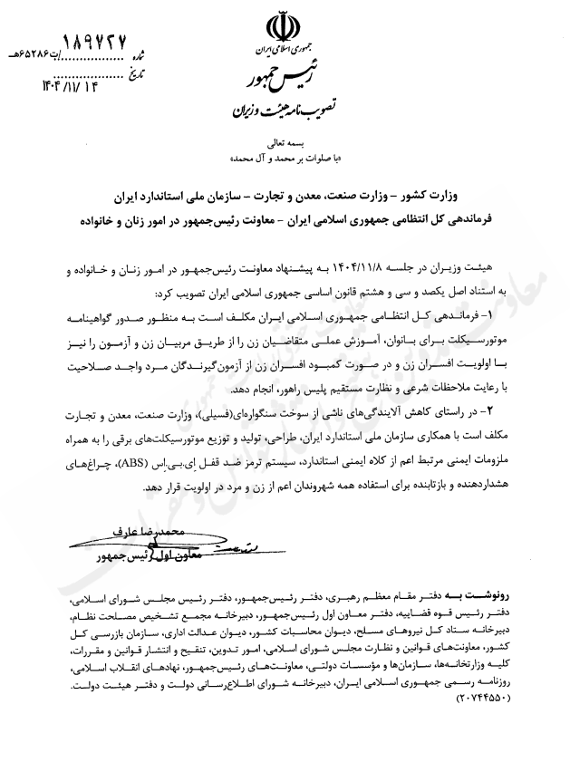 به گزارش وکلاپرس، تصویبنامه مصوب جلسه مورخ ۱۴۰۴/۱۱/۰۸ هیات وزیران درخصوص «تکلیف فرماندهی کل انتظامی جمهوری اسلامی ایران نسبت به صدور گواهینامه موتورسیکلت برای بانوان، آموزش عملی متقاضیان زن و برگزاری آزمون با نظارت مستقیم پلیس راهور» با شماره ۱۸۹۷۲۷ در تاریخ ۱۴۰۴/۱۱/۱۴ توسط معاون اول رییس جمهور ابلاغ شد.
