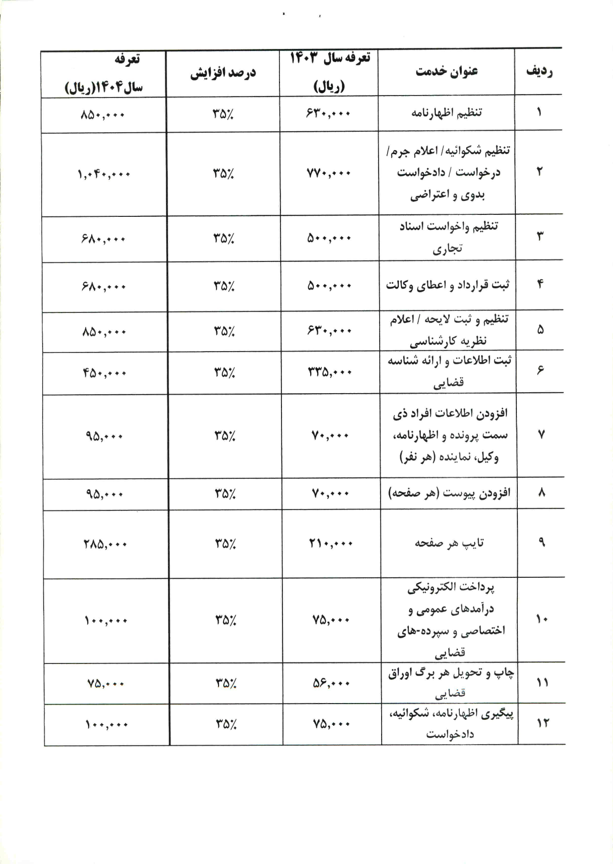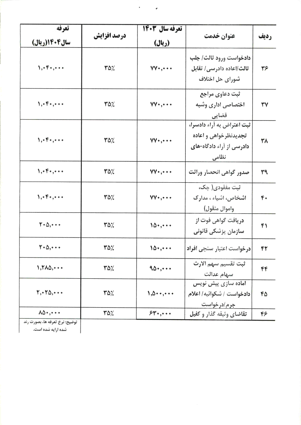 | ۳۳ | خدمات شبه قضایی | مطابق تعرفه اعلامی نهادهای متقاضی |