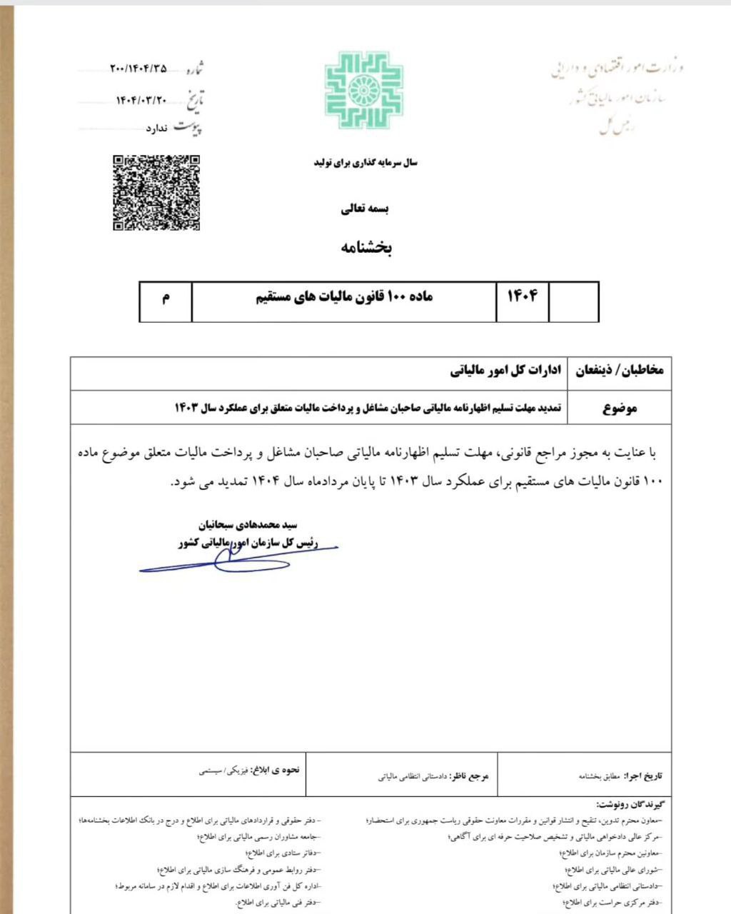 با عنایت به مجوز مراجع قانونی مربوطه مهلت تسلیم اظهارنامه مالیاتی صاحبان مشاغل و پرداخت مالیات متعلق سال ۱۴۰۳ تا پایان مردادماه سال ۱۴۰۴ تمدید می شود.
