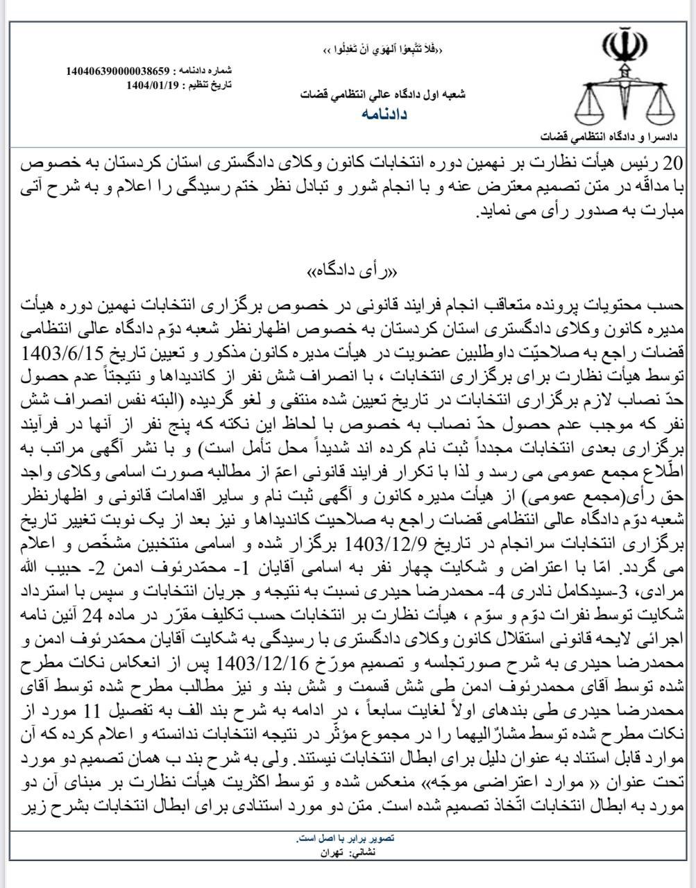نتیجه اینکه براساس مراتب با وارد تشخیص دادن اعتراض آقایان و خانمها امیر ضیاء الدینی، محمد مهرانی، کیوان شریفی نریمان امینی آزاده احمدی آرزو سجادی و مؤثر بودن دلائل ابرازی آنها و مخدوش بودن تصمیم مورخ ۱۴۰۳/۱۲/۱۶ اکثریت هیأت نظارت بر نهمین دوره انتخابات هیأت مدیره کانون وکلای دادگستری استان کردستان و عدم کفایت دلائل منعکس در تصمیم مورّخ فوق به استناد ماده ۲۵ آئین نامه اجرائی لایحه قانونی استقلال کانون وکلای دادگستری ضمن نقض تصمیم معترض عنه حکم بر صحت و اعتبار قانونی انتخابات مورخ ۱۴۰۳/۱۲/۹ آن کانون صادر میگردد. این رأی قطعی است.