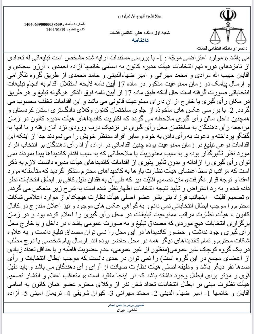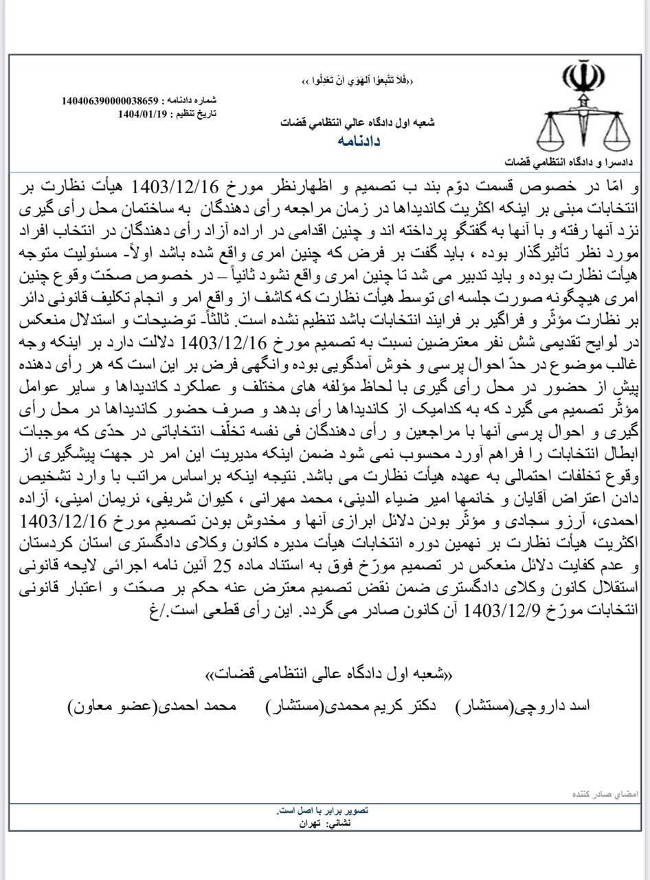 با اعتراض به این نتایج و تصمیم هیات نظارت مقرر گردید روز چهارشنبه مورخ ۱۵ اسفند ماه سال ۱۴۰۳ ساعت ۱۹:۳۰ در سالن اجتماعات کانون وکلای دادگستری کردستان با حضور معترضین مجدد نسبت به باز شماری آراء اخذ شده اقدام گردد.