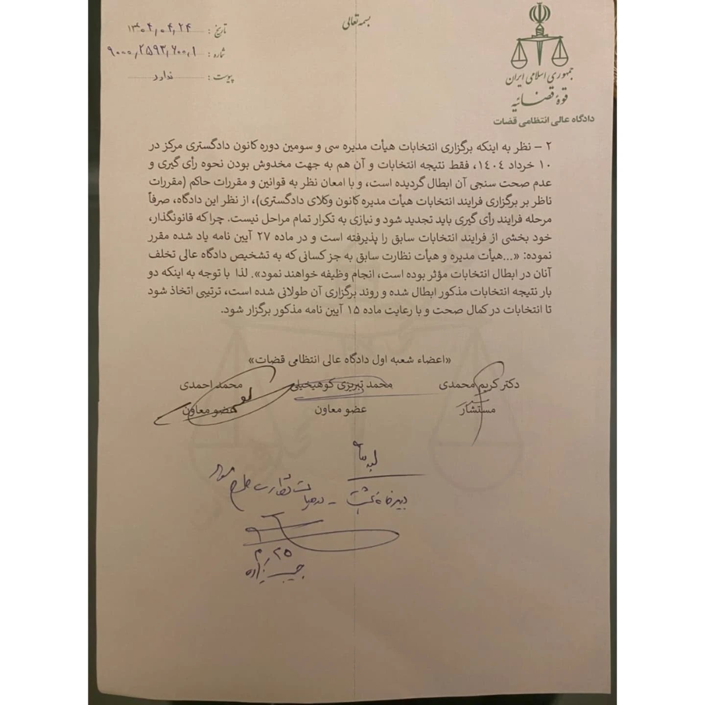 ۲ – نظر به اینکه برگزاری انتخابات هیأت مدیره سی و سومین دوره کانون دادگستری مرکز در ۱۰ خرداد ۱۴۰۴ ، فقط نتیجه انتخابات و آن هم به جهت مخدوش بودن نحوه رای گیری و عدم صحت سنجی آن ابطال گردیده است و با امعان نظر به قوانین و مقررات حاکم مقررات ناظر بر برگزاری فرایند انتخابات هیأت مدیره کانون وکلای دادگستری از نظر این دادگاه صرفاً مرحله فرایند رأی گیری باید تجدید شود و نیازی به تکرار تمام مراحل نیست. چرا که قانونگذار خود بخشی از فرایند انتخابات سابق را پذیرفته است و در ماده ۲۷ آیین نامه یاد شده مقرر نموده «…. هیات مدیره و هیأت نظارت سابق به جز کسانی که به تشخیص دادگاه عالی تخلف آنان در ابطال انتخابات مؤثر بوده است انجام وظیفه خواهند نمود.» لذا با توجه به اینکه دو بار نتیجه انتخابات مذکور ابطال شده و روند برگزاری آن طولانی شده است، ترتیبی اتخاذ شود تا انتخابات در کمال صحت و با رعایت ماده ۱۵ آیین نامه مذکور برگزار شود.