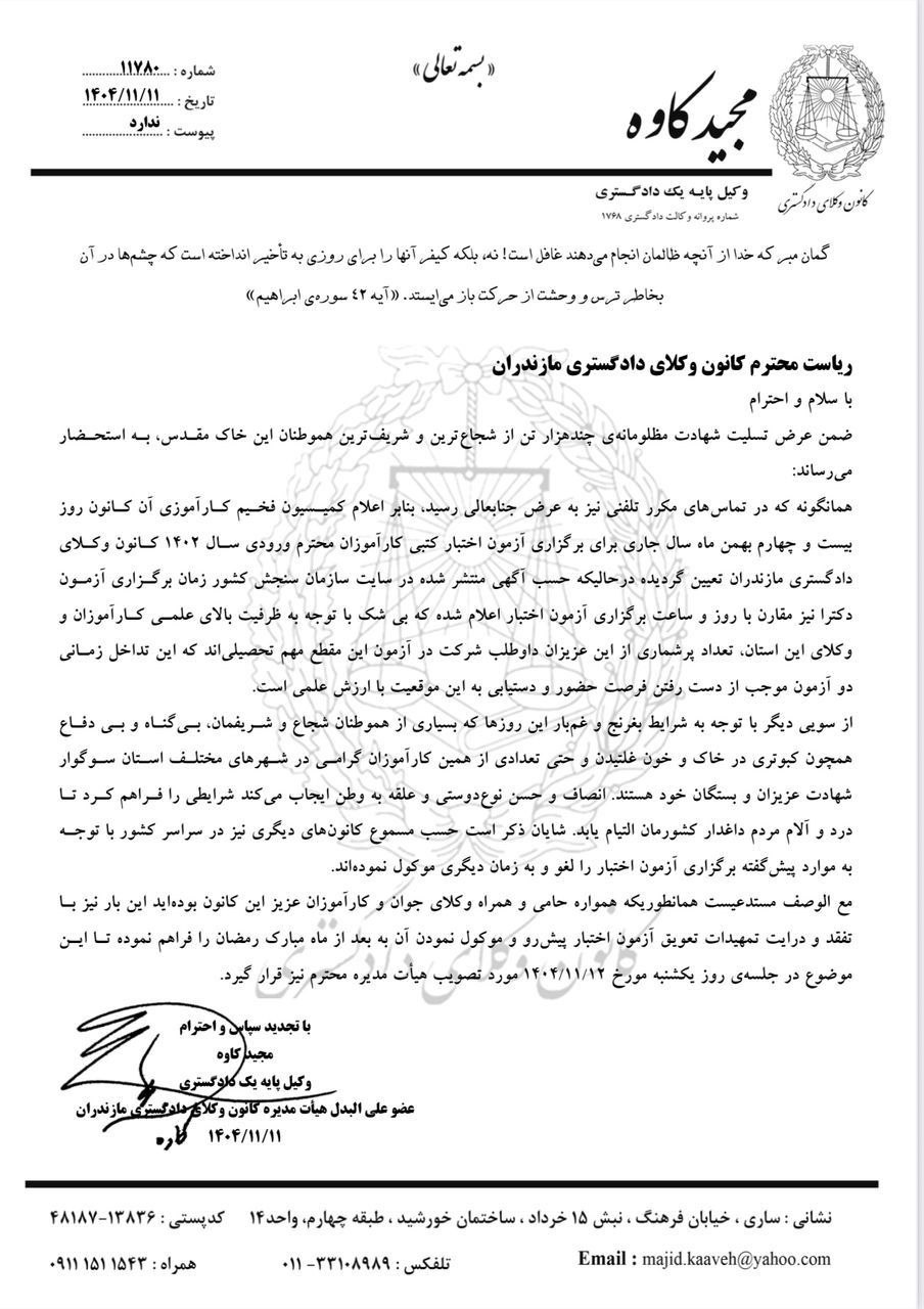 درخواست جمعی از کارآموزان کانون وکلای دادگستری مازندران برای تعویق آزمون اختبار