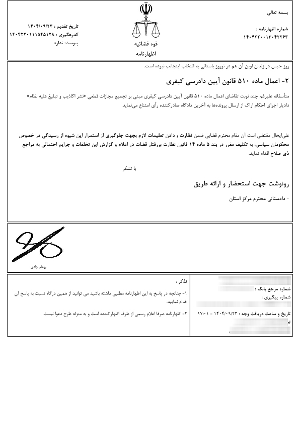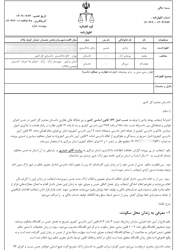 احتراماً اینجانب بهنام نزادی با توجه به حسب اصل ۱۶۲ قانون اساسی کشور و نیز جایگاه عالی نظارتی دادستان محترم کل کشور در حسن اجرای قوانین و هماهنگی بین دادسراها حسب ماده ۲۸۸ و ماده ۴۸۴ آیین دادرسی کیفری و بند ۵ ماده ۱۴ قانون نظارت بر رفتار قضات با یادآوری اصول بنیادین حاکم بر دادرسی کیفری از جمله اصل دادرسی منصفانه (ماده ۷ آیین دادرسی کیفری)، اصل بی طرفی مقام قضائی (ماده ۹۳ قانون آیین دادرسی کیفری)، اصل تسریع در رسیدگی و جلوگیری از اطاله دادرسی (ماده ۳ قانون آیین دادرسی کیفری) به عنوان محکوم سیاسی و امنیتی پرونده به شماره ۱۴۰۲۲۶۹۲۰۰۰۰۴۶۷۵۳۱ مطمح نظر در شعب ۱ و ۷ اجرای احکام کیفری استان مرکزی به استحضار میرساند؛