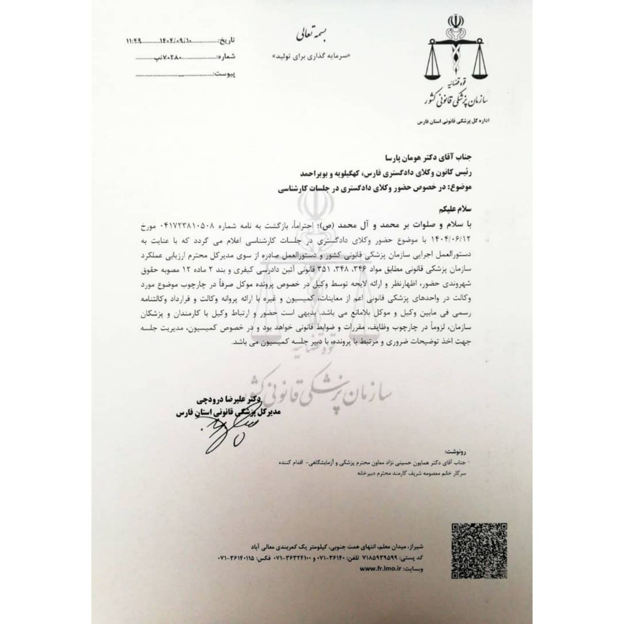 متن نامه رئیس کانون وکلای دادگستری فارس، کهگیلویه و بویراحمد به سازمان پزشکی قانونی: