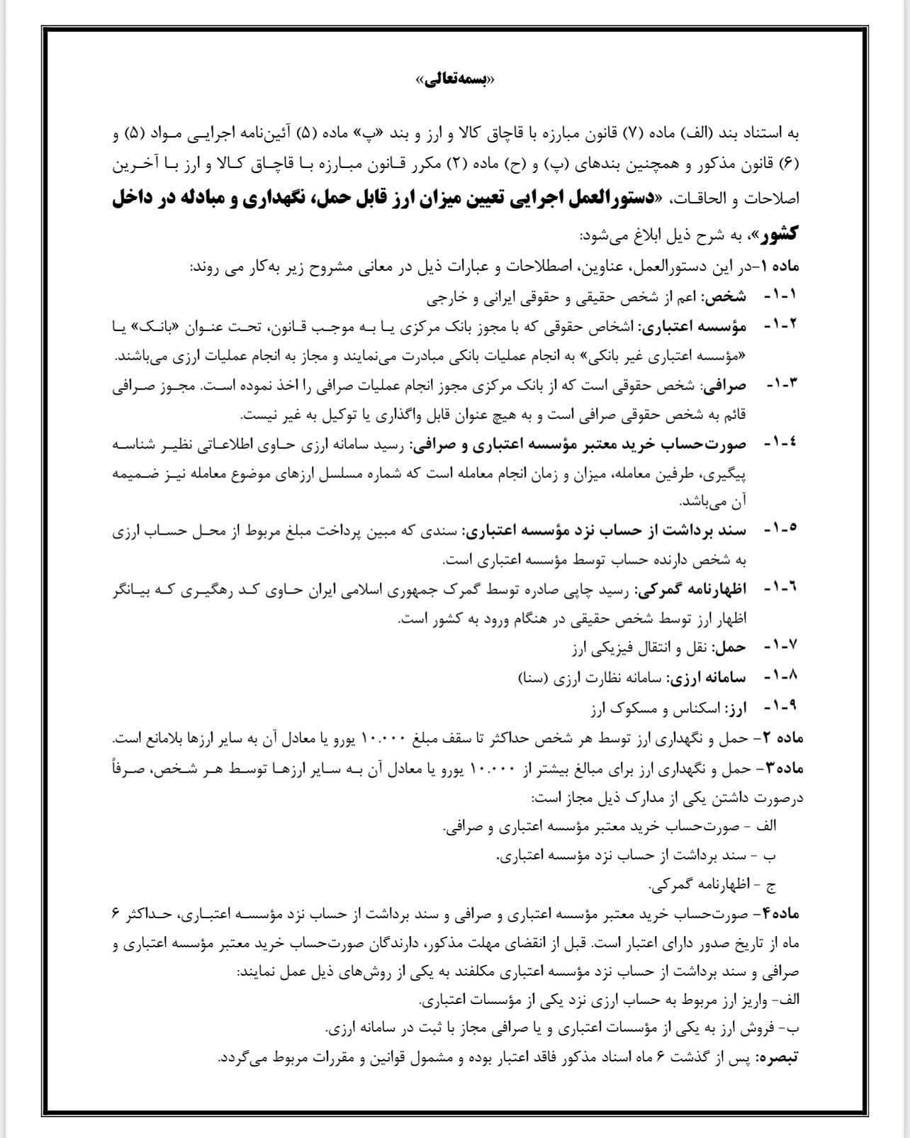 ماده۲- حمل و نگهداری ارز توسط هر شخص حداکثر تا سقف مبلغ ۱۰.۰۰۰ یورو یا معادل آن به سایر ارزها بلامانع است.