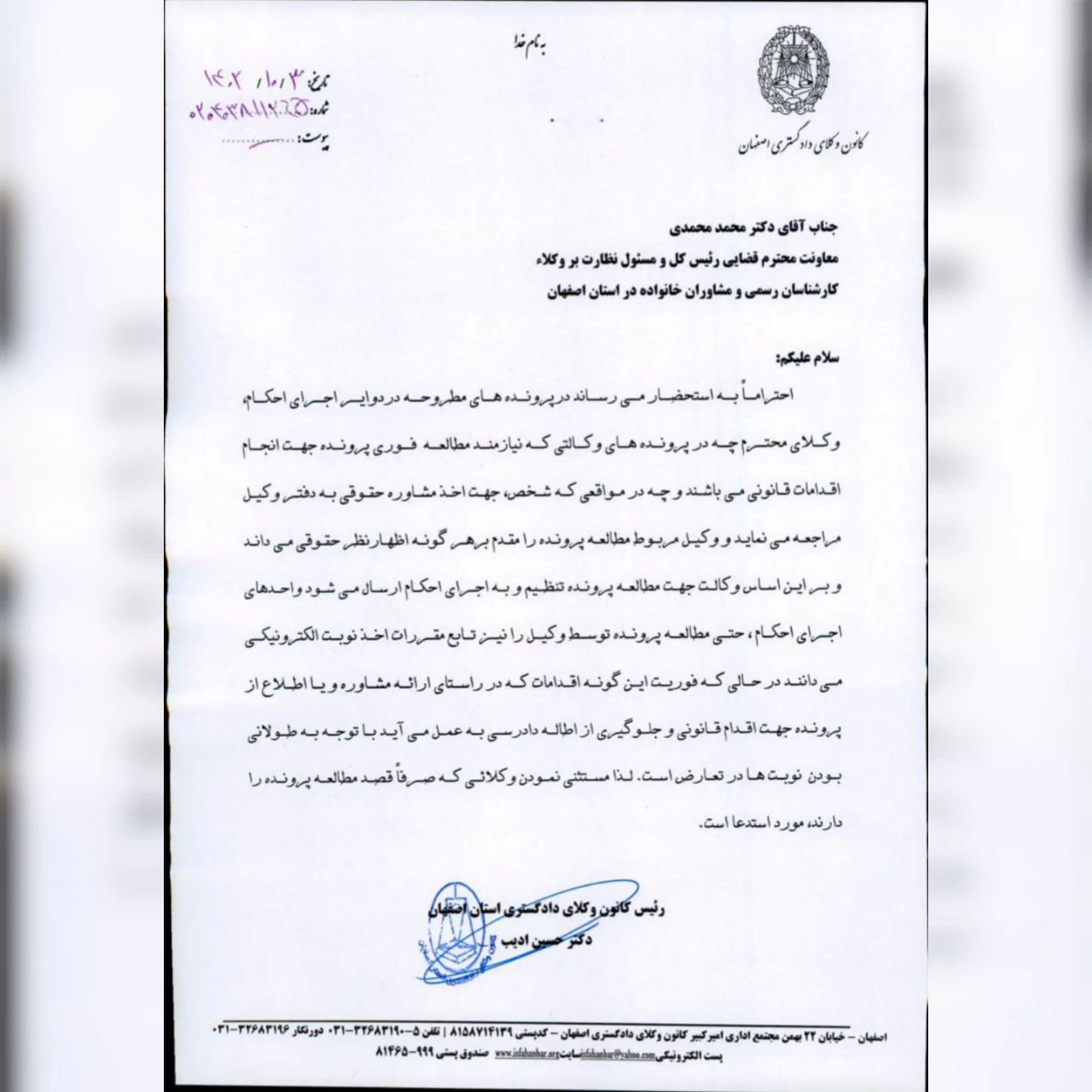 متن درخواست رئیس کانون وکلای اصفهان