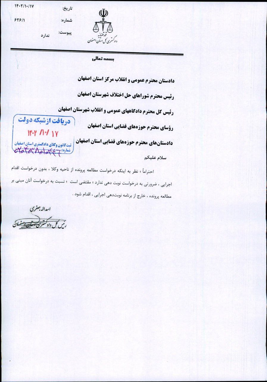 - رئیس کل محترم دادگاههای عمومی و انقلاب شهرستان اصفهان