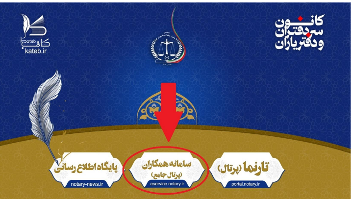 در قسمت پایین صفحه (طلایی رنگ) سه درگاه مشاهده می شود که درگاه وسط سامانه همکاران (پرتال جامع) که دارای دامنه eservice.notary.ir است. با کلیک بر روی آن وارد درگاه پرتال جامع می شویم. طبق تصویر زیر: