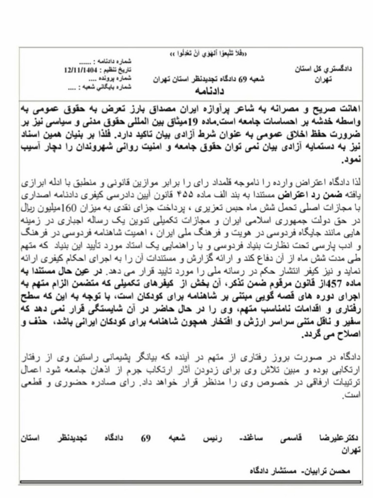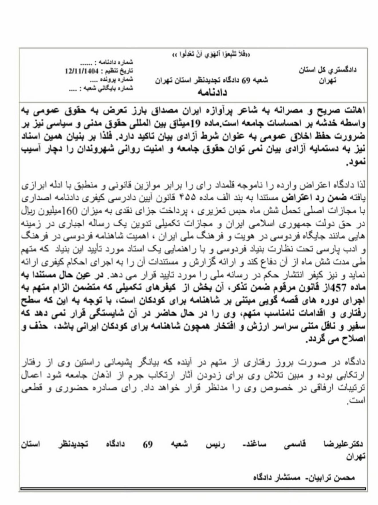 لذا دادگاه اعتراض وارده را ناموجه قلمداد رای را برابر موازین قانونی و منطبق با ادله ابرازی یافته ضمن رد اعتراض مستندا به بند الف ماده ۴۵۵ قانون آیین دادرسی کیفری دادنامه اصداری با مجازات اصلی تحمل شش ماه حبس تعزیر ، پرداخت جزای نقدی به میزان ۱۶۰ میلیون ریال در حق دولت جمهوری اسلامی ایران و مجازات تکمیلی تدوین یک رساله اجباری در زمینه هایی مانند جایگاه فردوسی در هویت و فرهنگ ملی ایران، اهمیت شاهنامه فردوسی در فرهنگ و ادب پارسی تحت نظارت بنیاد فردوسی و با راهنمایی یک استاد مورد تأیید این بنیاد که متهم طی مدت شش ماه از آن دفاع کند و ارائه گزارش و مستندات آن را به اجرای احکام کیفری ارائه نماید و نیز کیفر انتشار حکم در رسانه ملی را مورد تایید قرار میدهد. در عین حال مستندا به ماده ۴۵۷ از قانون مرقوم ضمن تذکر آن بخش از کیفرهای تکمیلی که متضمن الزام متهم به اجرای دوره های قصه گویی مبتنی بر شاهنامه برای کودکان است با توجه به این که سطحرفتاری و اقدامات نامناسب متهم، وی را در حال حاضر در آن شایستگی قرار نمی دهد که سفیر و ناقل متنی سراسر ارزش و افتخار همچون شاهنامه برای کودکان ایرانی باشد حذف و اصلاح می گردد.
