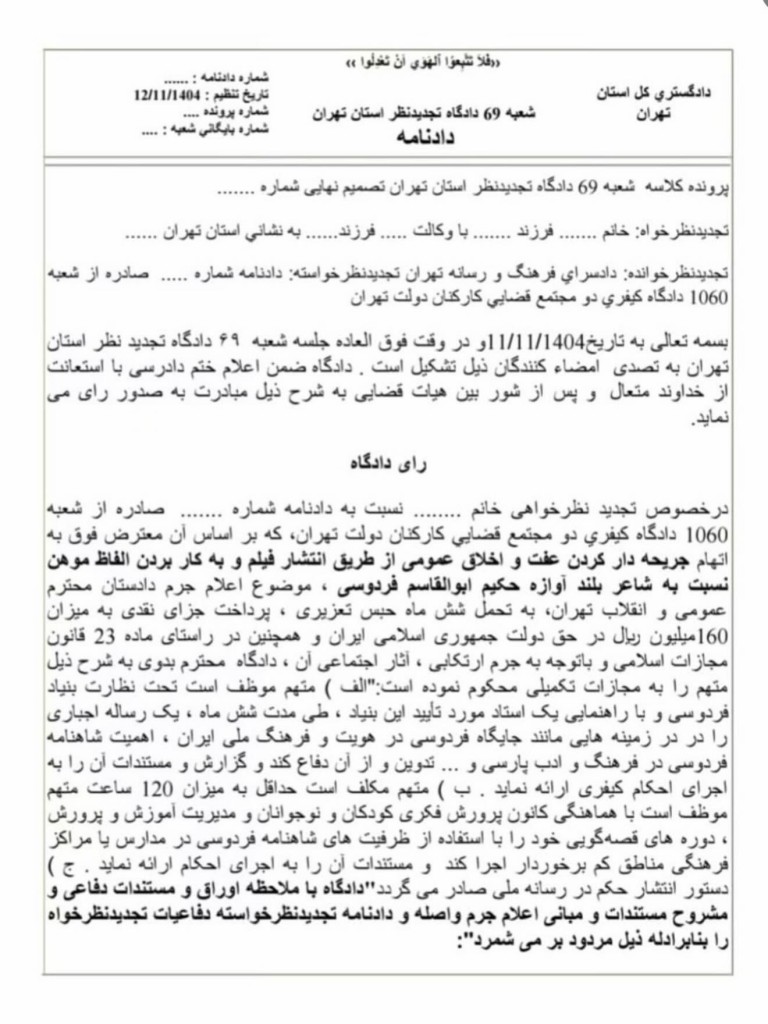 در خصوص تجدید نظرخواهی خانم … نسبت به دادنامه شماره …صادره از شعبه ۱۰۶۰ دادگاه کیفری دو مجتمع قضایی کارکنان دولت تهران که بر اساس آن معترض فوق به اتهام جریحه دار کردن عفت و اخلاق عمومی از طریق انتشار فیلم و به کار بردن الفاظ موهن نسبت به شاعر بلند آوازه حکیم ابوالقاسم فردوسی، موضوع اعلام جرم دادستان محترم عمومی و انقلاب تهران به تحمل شش ماه حبس تعزیری، پرداخت جزای نقدی به میزان ۱۶۰ میلیون ریال در حق دولت جمهوری اسلامی ایران و همچنین در راستای ماده ۲۳ قانون مجازات اسلامی و با توجه به جرم ارتکابی، آثار اجتماعی آن، دادگاه محترم بدوی به شرح ذیل متهم را به مجازات تکمیلی محکوم نموده است: