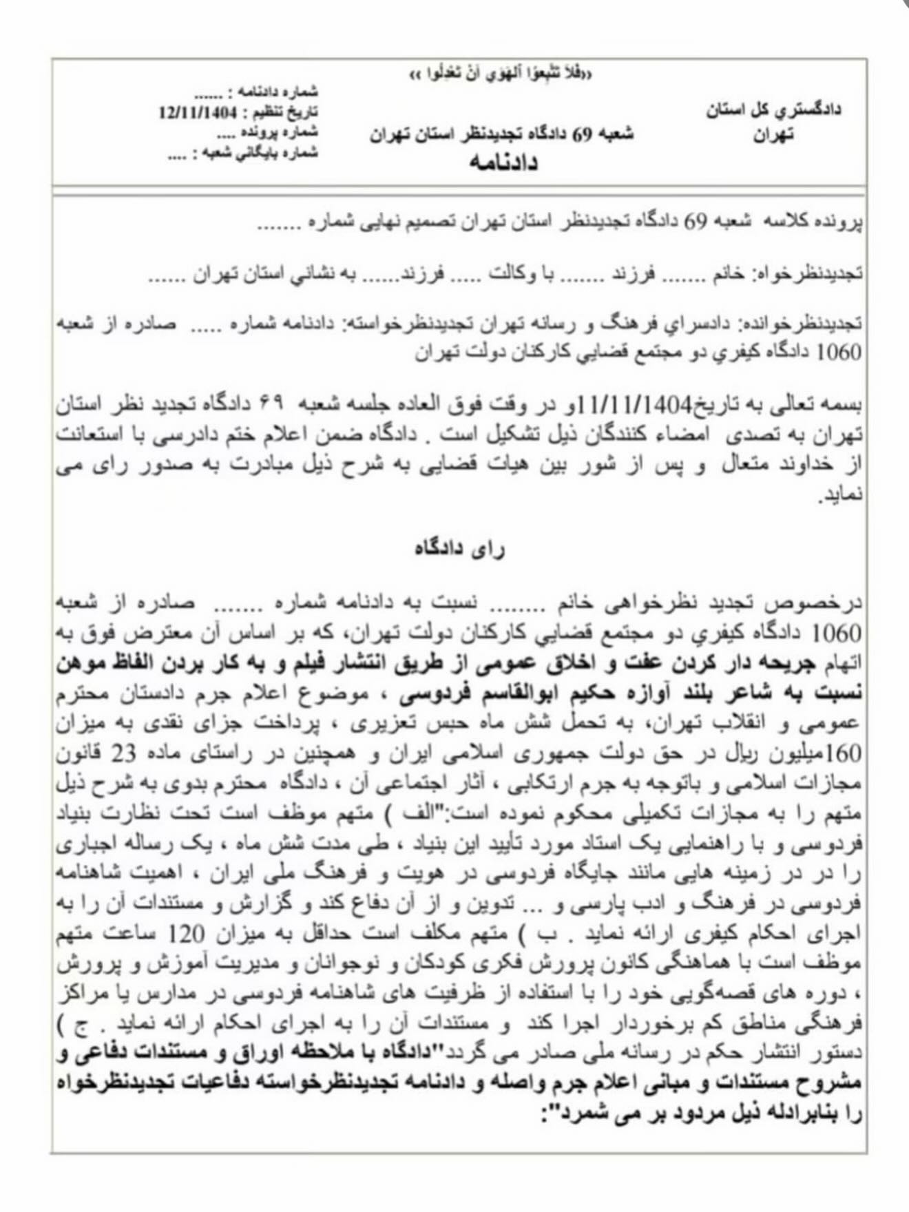 لذا دادگاه اعتراض وارده را ناموجه قلمداد رای را برابر موازین قانونی و منطبق با ادله ابرازی یافته ضمن رد اعتراض مستندا به بند الف ماده ۴۵۵ قانون آیین دادرسی کیفری دادنامه اصداری با مجازات اصلی تحمل شش ماه حبس تعزیر ، پرداخت جزای نقدی به میزان ۱۶۰ میلیون ریال در حق دولت جمهوری اسلامی ایران و مجازات تکمیلی تدوین یک رساله اجباری در زمینه هایی مانند جایگاه فردوسی در هویت و فرهنگ ملی ایران، اهمیت شاهنامه فردوسی در فرهنگ و ادب پارسی تحت نظارت بنیاد فردوسی و با راهنمایی یک استاد مورد تأیید این بنیاد که متهم طی مدت شش ماه از آن دفاع کند و ارائه گزارش و مستندات آن را به اجرای احکام کیفری ارائه نماید و نیز کیفر انتشار حکم در رسانه ملی را مورد تایید قرار میدهد. در عین حال مستندا به ماده ۴۵۷ از قانون مرقوم ضمن تذکر آن بخش از کیفرهای تکمیلی که متضمن الزام متهم به اجرای دوره های قصه گویی مبتنی بر شاهنامه برای کودکان است با توجه به این که سطحرفتاری و اقدامات نامناسب متهم، وی را در حال حاضر در آن شایستگی قرار نمی دهد که سفیر و ناقل متنی سراسر ارزش و افتخار همچون شاهنامه برای کودکان ایرانی باشد حذف و اصلاح می گردد.