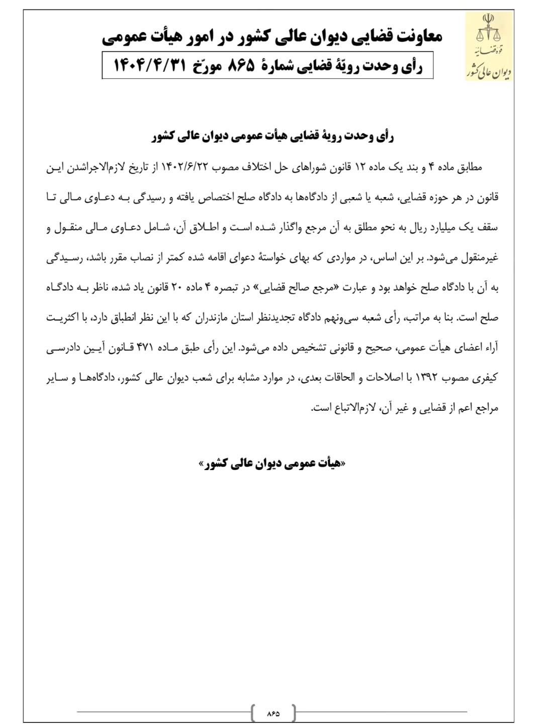 ج) رأی وحدت رویه شماره ۸۶۵ ـ ۱۴۰۴/۰۴/۳۱ هیأت عمومی دیوان عالی کشور