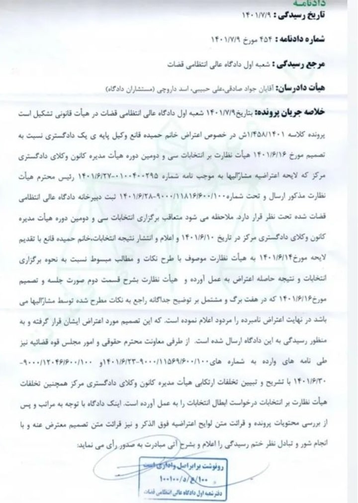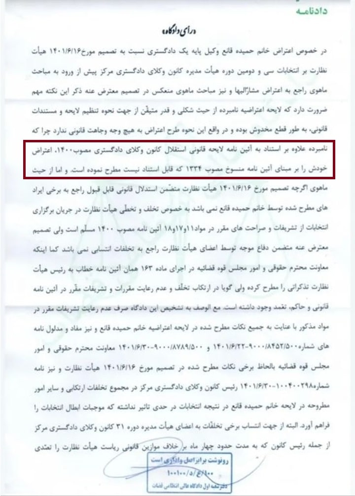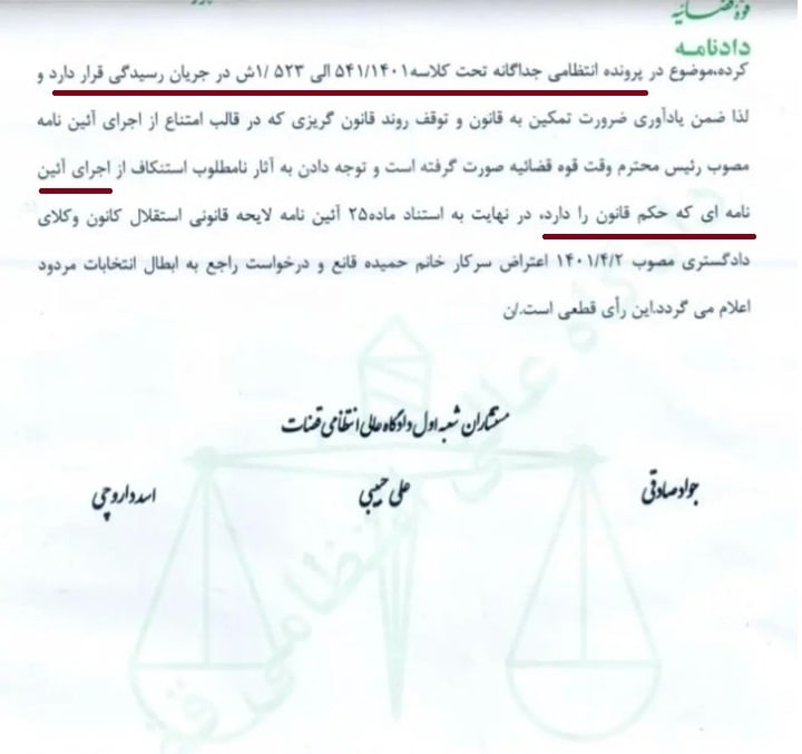 البته از جهت انتساب برخی تخلفات به اعضای هیات مدیره دوره ۳۱ کانون وکلای دادگستری مرکز از جمله رئیس کانون که به مدت حدود چهار ماه بر خلاف موازین قانونی ریاست هیأت نظارت را تصدی دادنامه کرده، موضوع در پرونده انتظامی جداگانه تحت کلاسه ۵۴۱/۱۴۰۱ الی ۵۲۳ / ۱ ش در جریان رسیدگی قرار دارد و لذا ضمن یادآوری ضرورت تمکین به قانون و توقف روند قانون گریزی که در قالب امتناع از اجرای آئین نامه مصوب رئیس محترم وقت قوه قضائیه صورت گرفته است و توجه دادن به آثار نامطلوب استنکاف از اجرای آئین نامه ای که حکم قانون را دارد، در نهایت به استناد ماده ۲۵ آئین نامه لایحه قانونی استقلال کانون وکلای دادگستری مصوب ۱۴۰۱/۴/۲ اعتراض سرکار خانم حمیده قانع و درخواست راجع به ابطال انتخابات مردود اعلام می گردد. این رأی قطعی است.
