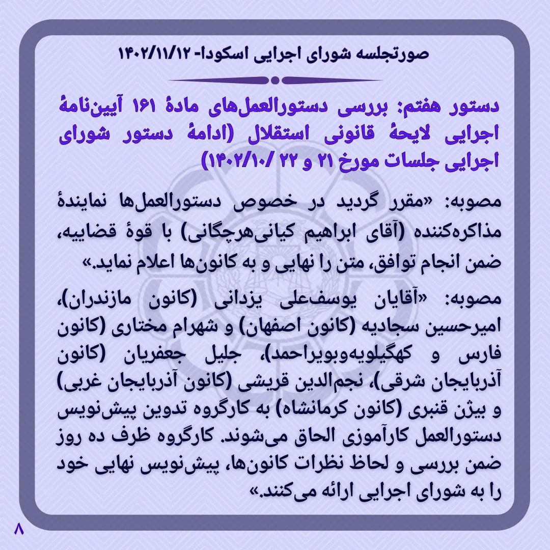 مصوبه: مقرر گردید در خصوص دستور العمل ها نماینده مذاکره کننده (آقای ابراهیم کیانی هرچگانی) با قوه قضاییه ضمن انجام توافق متن را نهایی و به کانون ها اعلام نماید.