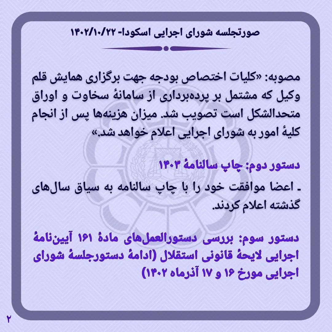 مصوبه: «موضوع “اصلاح ماده ۵۴ آیین نامه اجرایی لایحه قانونی استقلال کانون وکلای دادگستری” به عنوان دستور چهارم جلسه تعیین شد.»