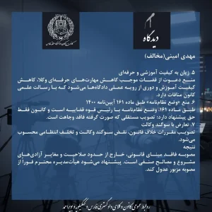 مصوبه فاقد مبنای قانونی خارج از حدود صلاحیت و مغایر آزادی های مشروع و مصالح صنفی است پیشنهاد میشود هیأت مدیره محترم فورا از مصوبه مزبور عدول کند.