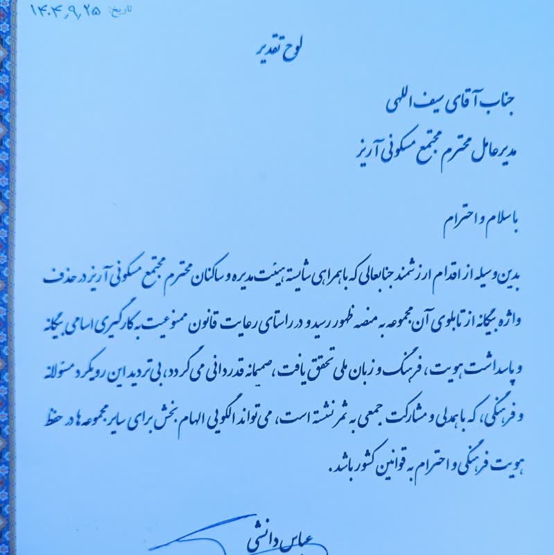 تجلیل از اقدام فرهنگی یک واحد مسکونی در یزد برای تغییر نام بیگانه در راستای صیانت از زبان فارسی
